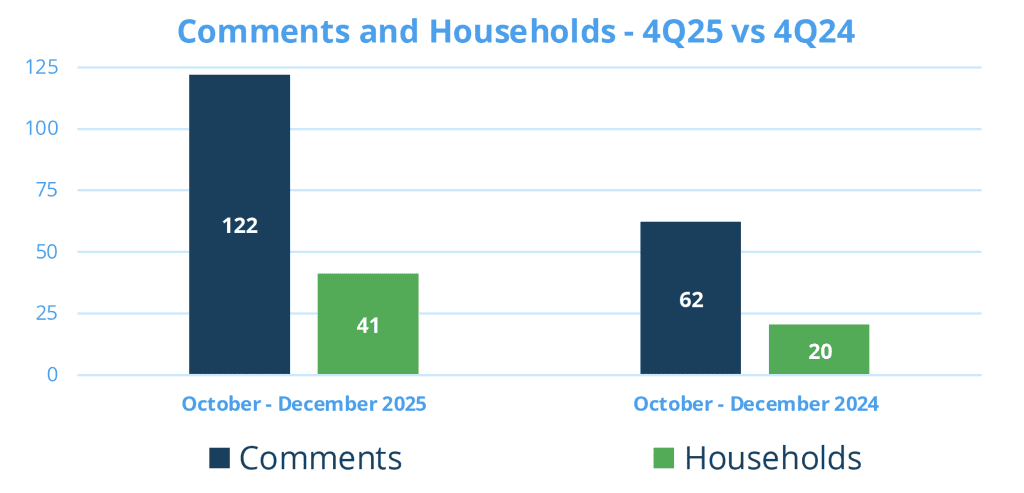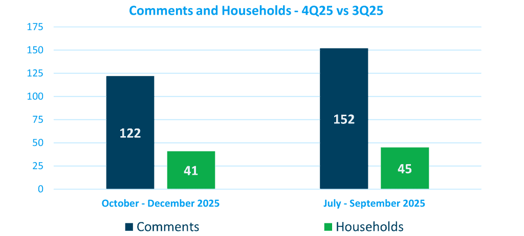 - In comparison to July – September 2025 (3Q25), 30 fewer comments were filed and four fewer households filed comments.