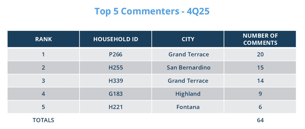 The top five distinct households filing comments in 4Q25 reside in Grand Terrace, San Bernardino, Highland, and Fontana. Together, they filed 64 (or 52%) of the total comments.