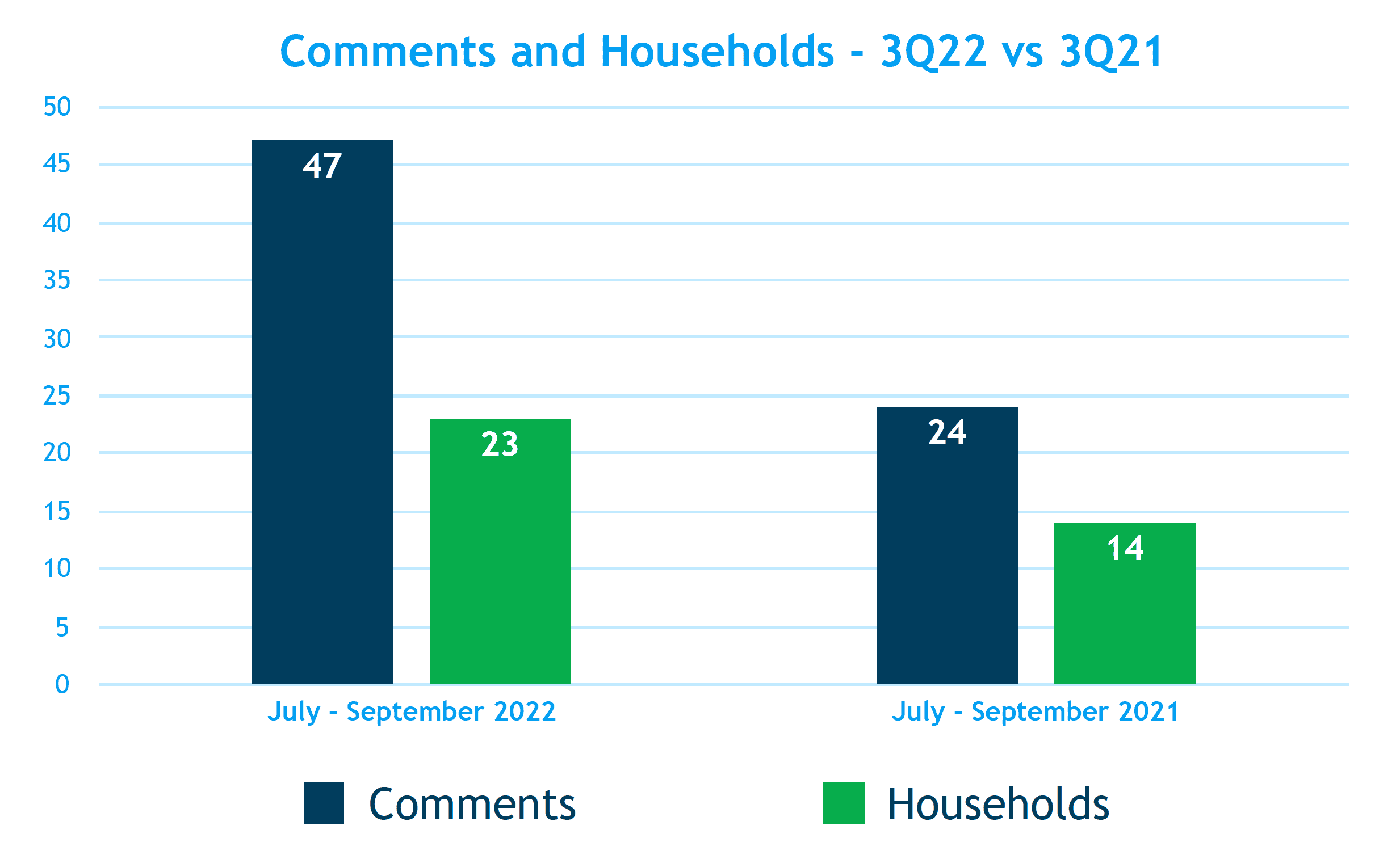 - Compared to July – September 2021 (3Q21), there was a year-over-year increase in both the number of noise comments received and the number of distinct households filing comments. 23 more comments were filed by 9 additional households in 3Q22.